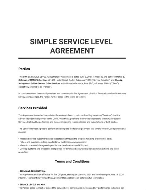 List Of Simple Service Level Agreement Template Doc