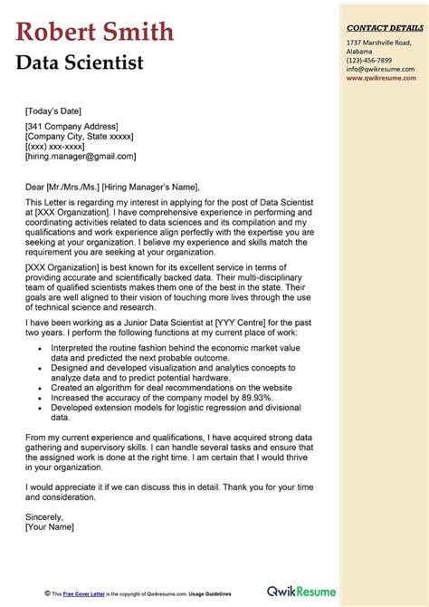 Professional Cover Letter Template Data Science. Identify key skills, experience requirements, qualifications and keywords. Include your contact information add your first name, last name, phone number, email address, city and state or union territory at the top of your cover letter.