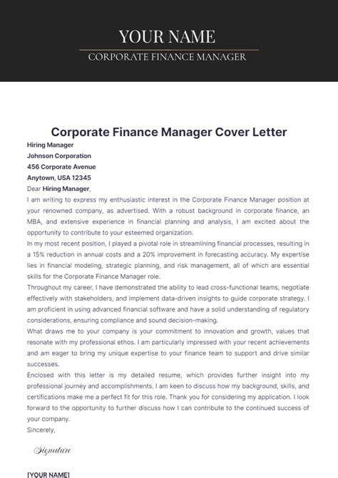 Here’s a great example of a professional and properly formatted finance cover letter: Start with a header you typically start your cover letter with information that enables the hiring manager to contact you. Dear jericka alfieri, i am writing to express my interest in the finance manager position at jpmorgan chase.