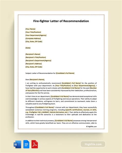 Web writing the recommendation or letter many people will know what the recipient did and the impact of his efforts. ___ have been a firefighter with our department for the passed ___ years, and during that time has consistently demonstrated excellence in his or hierher work. Our template provides a comprehensive outline for you to follow and includes all the necessary information to create a standout letter.