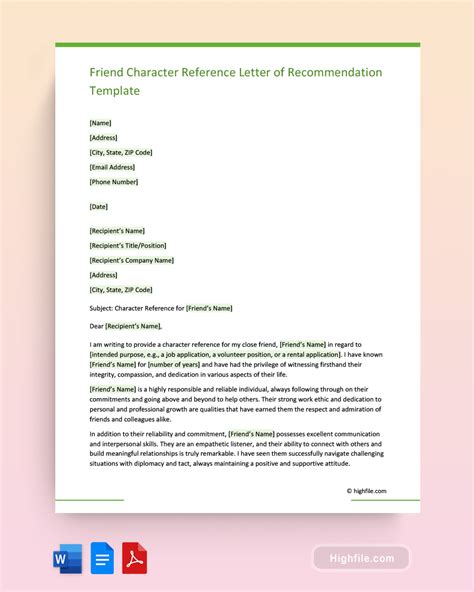 Professional Friend Character Reference Letter Of Recommendation Template