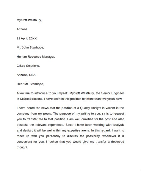 +29 Job Transfer Request Letter Template. You can request a transfer to continue your employment within the same company, as long as you have a valid reason. There are many reasons for preparing and sending a transfer letter of intent.