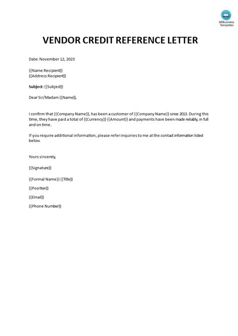 Elegant Vendor Credit Reference Letter Template. Credit reference letter sample 01. It is often requested by lenders, landlords, or other institutions that need to assess the financial risk of doing business with the person or entity in question.