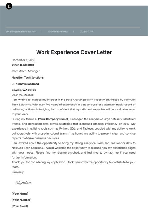Plus, a great cover letter that matches your resume will give you an advantage over other candidates. As the work experience letter is a professional document, you should always write it on the company letterhead. To attached my resume for your convenience.