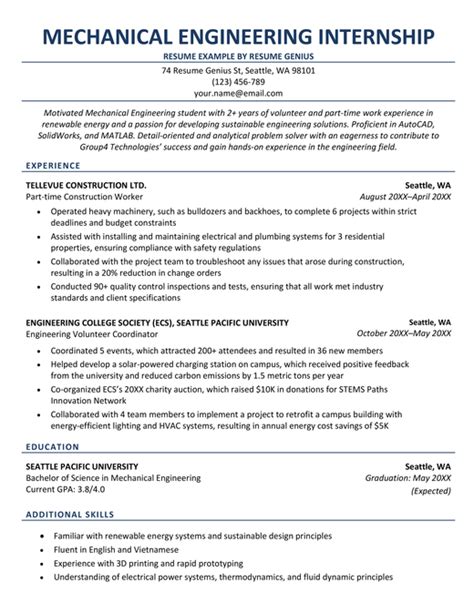 Providing support in performance of plant engineer, production manager, eh&s manager and maintenance manager responsibilities. Add all of your contact details in your engineering internship resume header. Land your dream job with free, customizable resume templates.