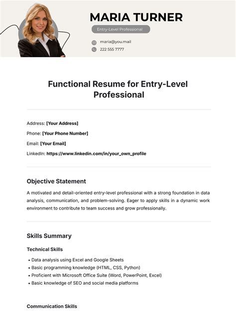 Free Entry Level Functional Resume Template. This guide will show you: View the experience section (s) as a chance to give examples of your success in carrying out the basic duties of your profession.